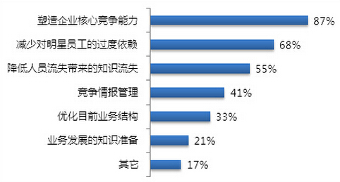 在了解知识管理如何支撑战略发展的认识上,有87%的企业认为可以提高核心竞争能力,紧随其后的是减少对明星员工的依赖以及降低人员流失所带来的知识流失。从企业的选择上看,目前企业对知识管理的工作更聚焦于对目前的战略以及业务发展进行支撑,对知识管理如何支撑未来战略的思考相对偏少。但总体来说,企业都希望能够避免对员工的依赖,打造企业的核心竞争能力。