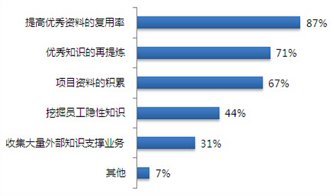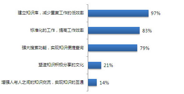 在知识管理如何提高员工工作效率方面,企业更多的看中如何将优秀知识进行复用,并占到了87%。同时,对优秀知识再提炼达到了71%。知识更好的服务于业务是目前企业非常关心的内容。在大家广泛谈到的隐性知识挖掘的问题上,选择数量并不高。在实际的知识管理工作中,我们也认为实现隐性知识挖掘需要一个漫长的过程,首先实现优秀知识的服用和知识对业务的支撑才是具有较高投入产出比的工作方式。