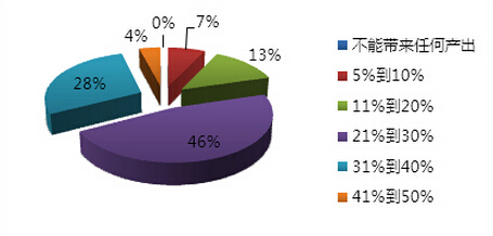 在许多企业非常关心“知识管理能给企业的工作效率提高多少”的问题上,我们也进行了调查。我们发现企业普遍还是对知识管理能对企业工作效率提高上有一定的预期,绝大多数企业选择了20%到30%。从这点看,企业对知识管理工作能带来的产出带着比较乐观、客观的心态。并且,值得欣喜的是,没有企业认为知识管理不能带来价值。