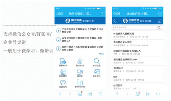 2 基于企业号、公众号的H5方案:微信公众号 企业号登录挂接H5的微知识库,通过微知识库可以进行知识的访问 分类查找 互动等操作。