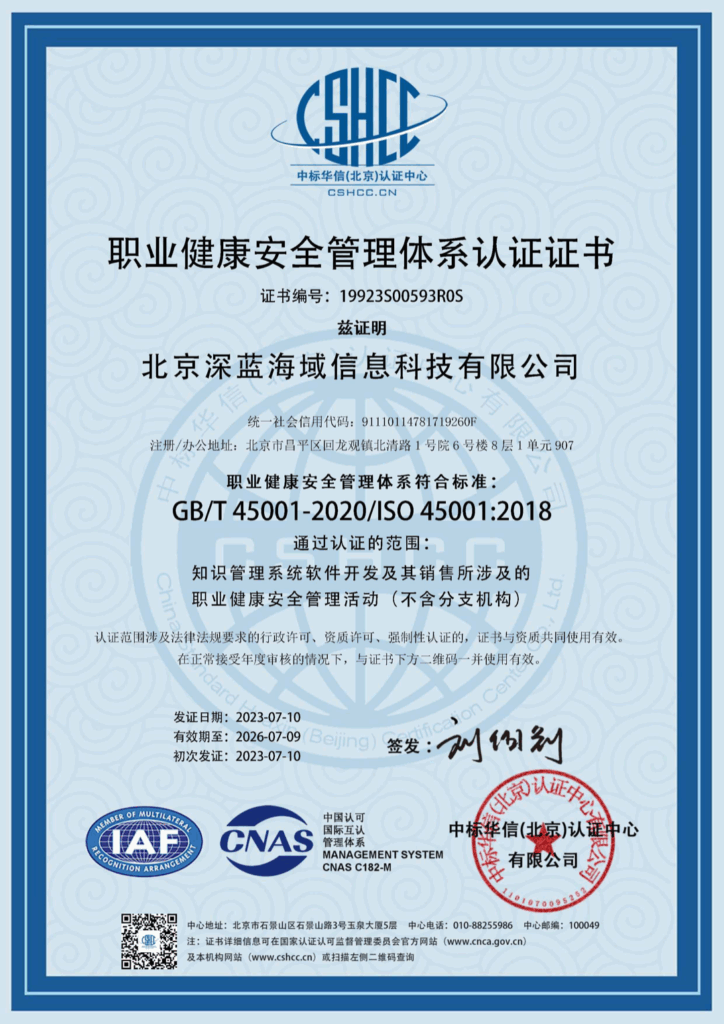 展望未来,深蓝海域将继续坚持以客户为中心,持续深化安全双体系建设,不断提升信息安全保障能力和职业健康安全管理水平。同时,公司还将根据业务发展需要,适时积极考虑引入其他管理体系,为合作伙伴提供更加完善、可靠的知识管理服务,助力企业加速数字化转型,提升核心竞争力。