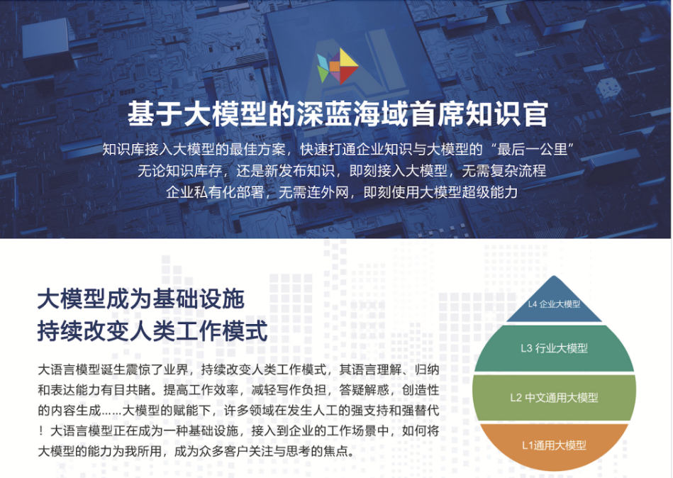 作为知识管理领域的卓越领先企业,深蓝海域积极拥抱大模型带来的知识智能变化,推出了基于大模型的首席智能知识官,实现致力于为企业提供卓越的知识管理服务,完成对知识管理的全面大模型重构,实现了智能知识采集、智能知识创作与加工、智能知识搜索和智能知识CAHT问答,以及智能化知识运营。我们深知,在数字化时代,知识已经成为企业最宝贵的财富,如何高效地管理、利用和传递知识,直接关系到企业的竞争力和发展潜力。因此,我们始终将技术创新作为企业发展的核心驱动力,不断探索新的技术应用和解决方案。
