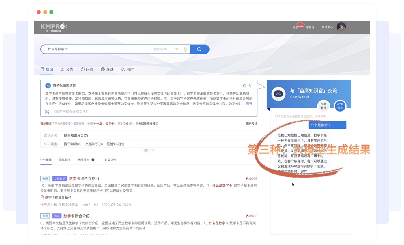 进行企业级知识库搜索时,接入Deepseek能力,实现一键三连智能搜索,即一次搜索提问可获得全文搜索结果(篇章级)、原子化段落搜索结果(段落级),以及大模型生成式问答结果(语义级)。