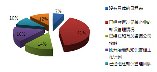 在我们走访过的部分建筑设计企业中,我们发现在知识管理工作的推进中,绝大多数企业都处在考察过兄弟单位的阶段。大家都有对知识管理美好预期的憧憬,认为知识管理可以为自己企业的提升提供帮助,只是绝大多数的企业都还在观望状态。但可喜的是目前没有具体日程表的企业仅占我们样本量中的7%,并且已经有10%的企业已经上线了知识管理系统。绝大多数企业认为知识管理工作对建筑设计企业而言是势在必行的一项举措。
