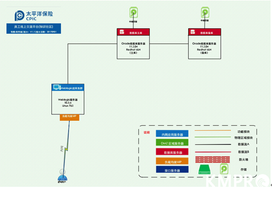 KMPRO根据太平洋保险的需求,考虑到太平洋产险员工交流互动平台随着并发访问量和数据量不断增大,采用了水平扩容Web服务的架构部署方案,为了解决安装防火墙后外部网络的访问用户不能访问内部网络服务器的问题,KMPRO特采用了DMZ方式部署。