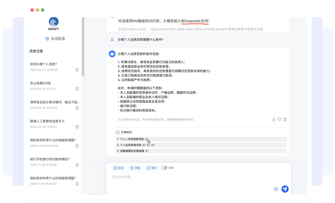 快速构建、导入、录入企业知识,自动原子化处理知识加工、向量计算,对接Deepseek大模型,基于企业知识库内容,遵循不同用户的知识权限,结实现更务实、更专业、更贴近企业业务实际的AIGC生成式问答结果。